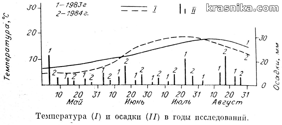 В 1983 г. во всех изучаемых ценопопуляциях в большинстве случаев отмечено более высокое содержание аскорбиновой кислоты, чем в 1984 г. Это можно объяснить различиями в погодных условиях вегетационных периодов. В 1983 г. летний сезон был более засушливым, чем в 1984 г. Распределение осадков в летние месяцы имело следующий характер: в июне 35 мм, июле 42, августе 32 мм, в 1984 г. соответственно 75, 31, 61 мм. Известно, что избыточное увлажнение почвы и воздуха приводит к снижению синтеза аскорбиновой кислоты [землянухин, 1956, 1964; Спиридонова, 1968; и др.]. Температурные данные в годы исследований также отличались (см. рисунок). В 1983 г. среднесуточная температура воздуха была ниже нормы - в июне на 2-4°С, в июле на 2-3°С. Эти условия были благоприятны для синтеза витамина С, так как, по литературным данным [Спиридонова, 1968; и др.], понижение температуры воздуха положительно влияет на накопление аскорбиновой кислоты в плодах растений. А. М. Гродзинский и Д. М. Гродзинский [1973] указывают, что в средней полосе Союза в плодово-ягодных культурах витамина С больше, чем в тех же сортах и видах на юге нашей страны.